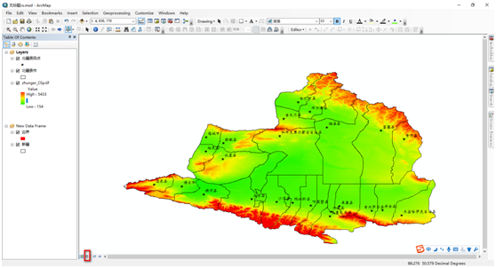 2 加载数据:打开ArcGIS软件,加载需要出图的数据,如下图1:加载了新疆北疆地区的栅格数据、一些县市、主要居民点位置矢量数据(数据来源:国家基础地理信息库);