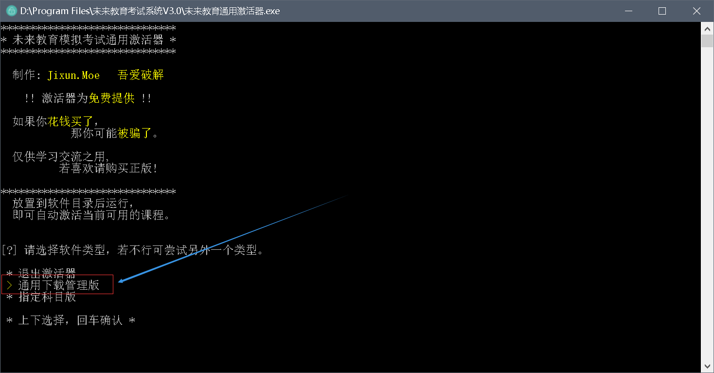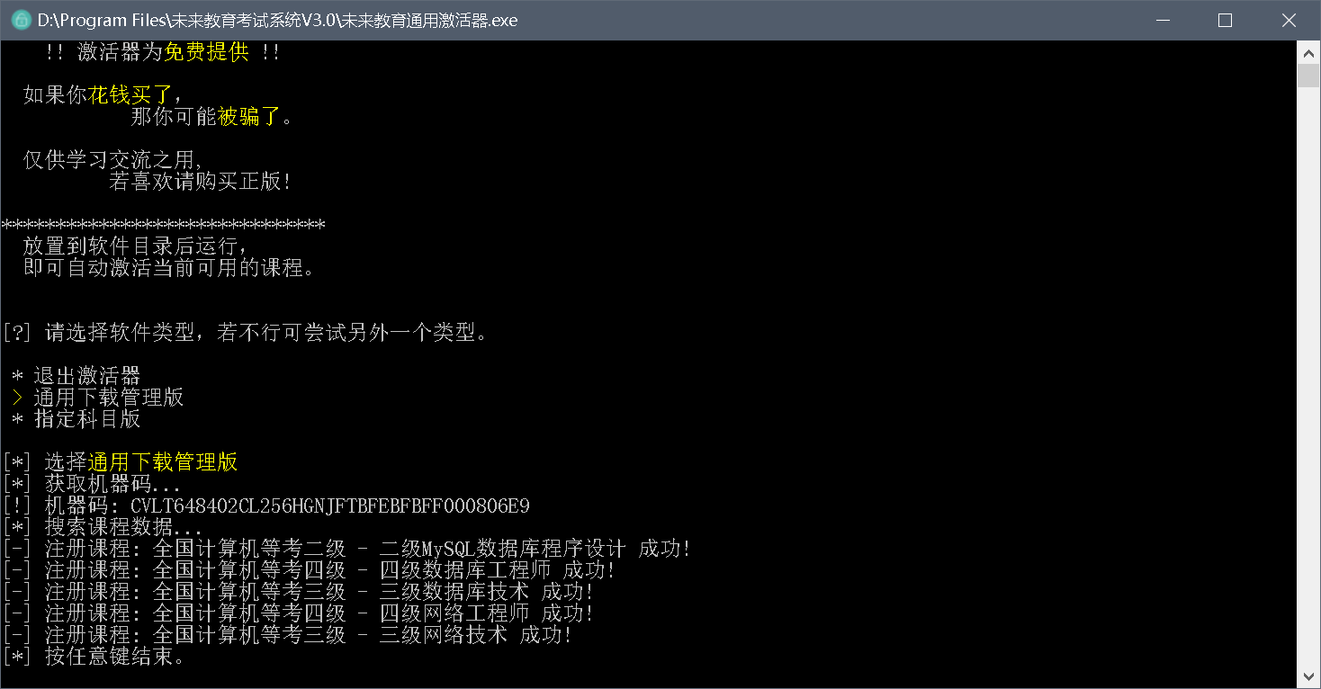 5、双击[未来教育通用激活器.exe]注册文件工具, 按下功能键选择 通用版本号 如图所示, 完成破解。
