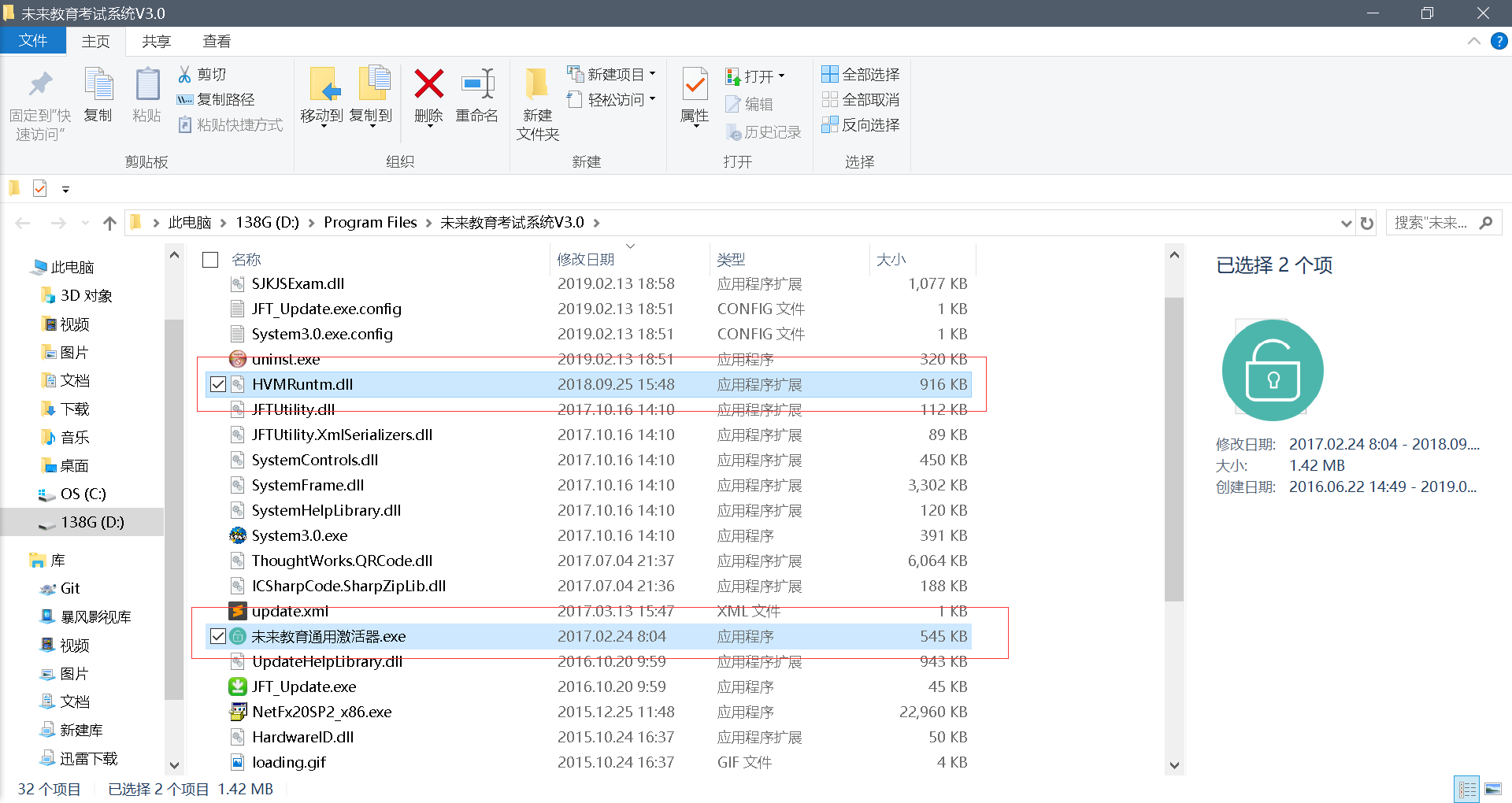 请在软件根目录中打开,并用于复制[HVMRuntm.dll]和[未来教育通用激活器.exe]这两个程序文件至该目录中,并将其覆盖至原有的位置。