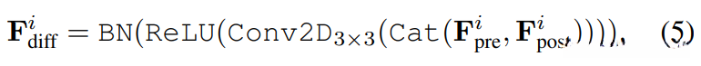 差异模块通过前后两个时间相段的影像在不同层次上进行特征提取,并结合concat操作进行融合。随后采用3×3卷积层配合ReLU激活函数以及Batch Normalization(BN)进一步对特征进行深度加工。