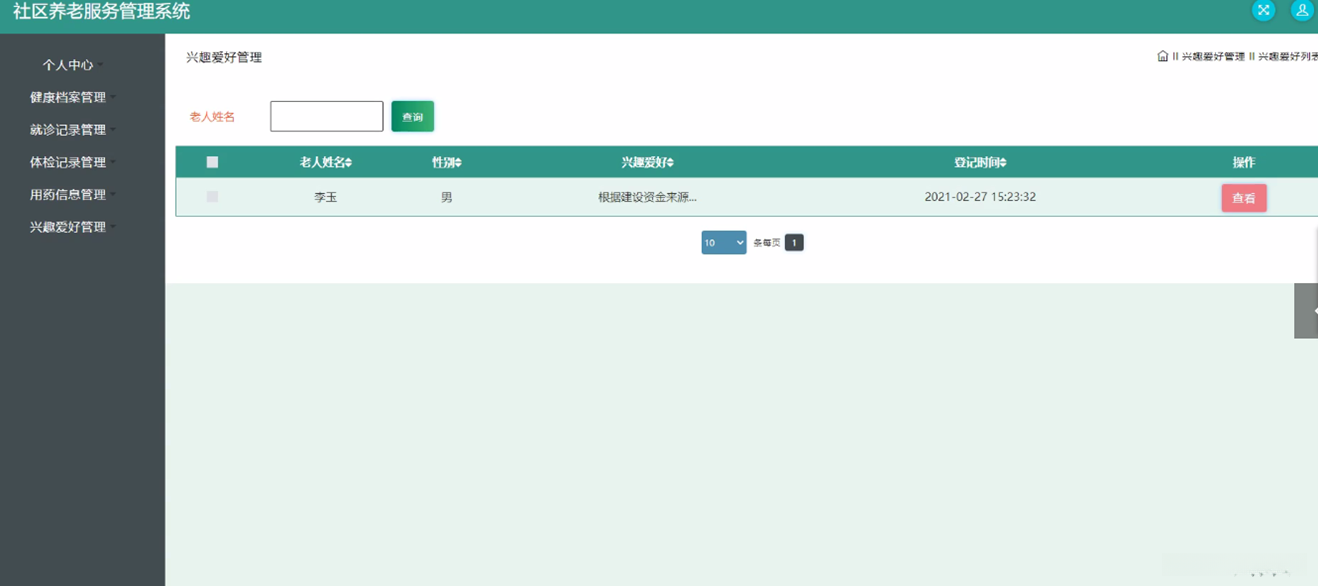 兴趣爱好管理:以列表的形式显示老人的基本信息包括姓名、性别以及当前的兴趣爱好和登记时间供用户完成常见操作如图5-8所示