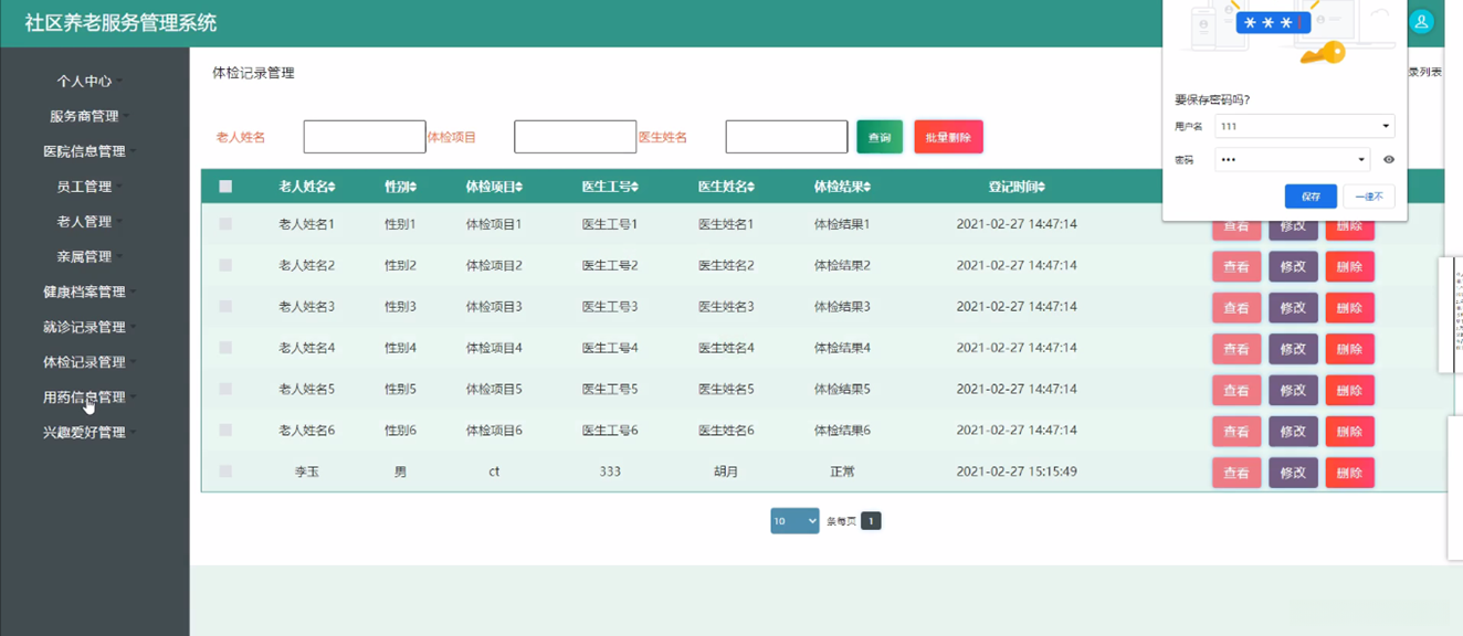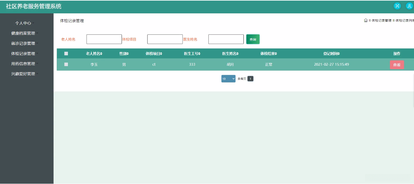 体检记录管理:采用电子表格形式对老年患者的基本信息及详细医疗数据进行查询展示功能。系统支持从患者档案中调取包括年龄层次划分在内的各项基础资料,并对医疗数据实施标准化存储与计算处理流程。通过调用相关数据库资源实现数据的实时更新与准确检索功能,并将结果以清晰表格形式呈现给医护人员供参考分析。如图5-5所示为操作界面示意图