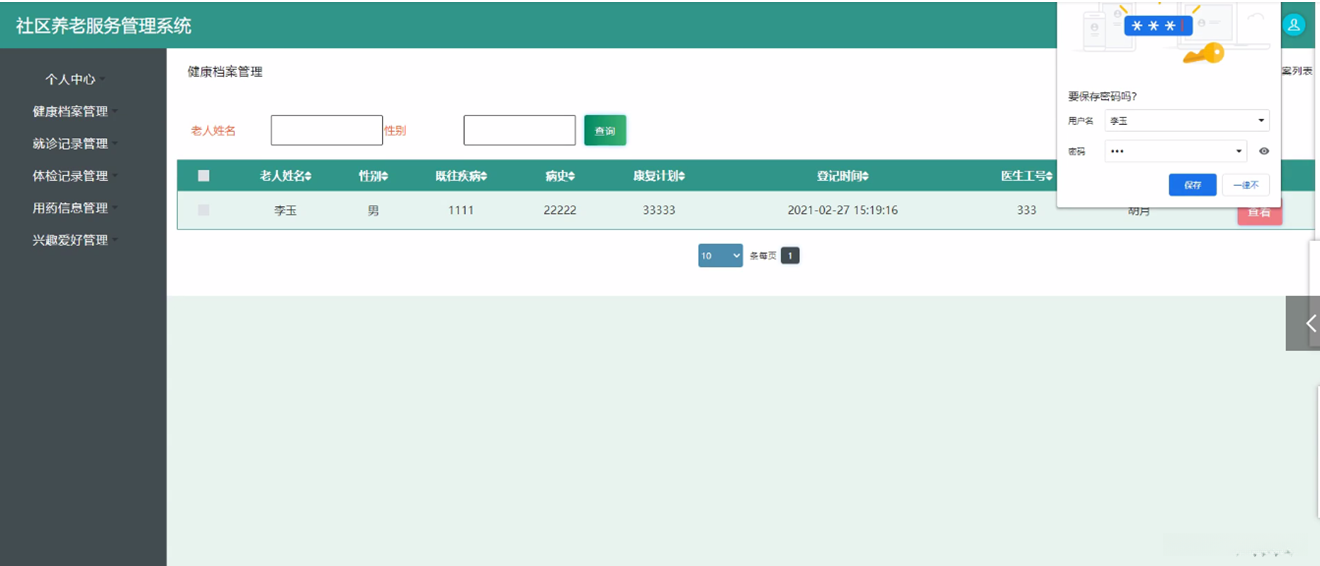 就诊记录管理模块:系统提供一个信息列表供用户浏览和管理老年人的基本信息包括详细病史记录以及与其相关的病历资料。该模块支持的操作包括数据查询与筛选可通过下拉菜单选择不同时间段或疾病类别快速定位所需医疗档案。同时系统还提供直观的操作界面让用户轻松完成相关事务操作流程如图5-4所示的界面展示。