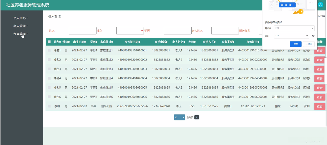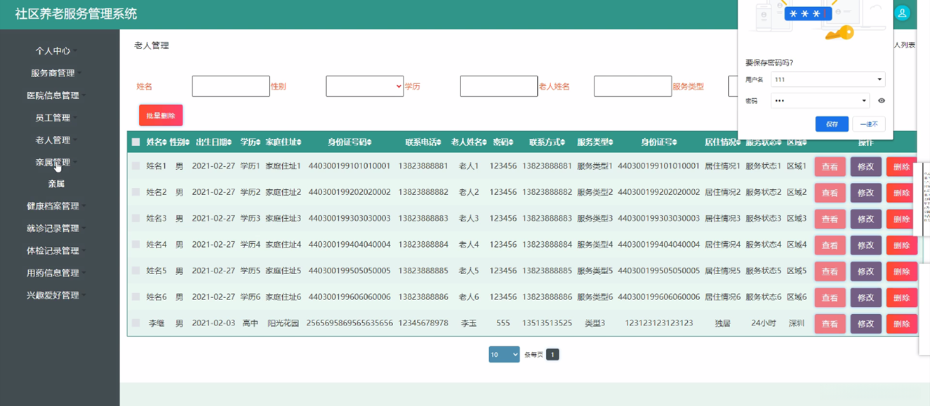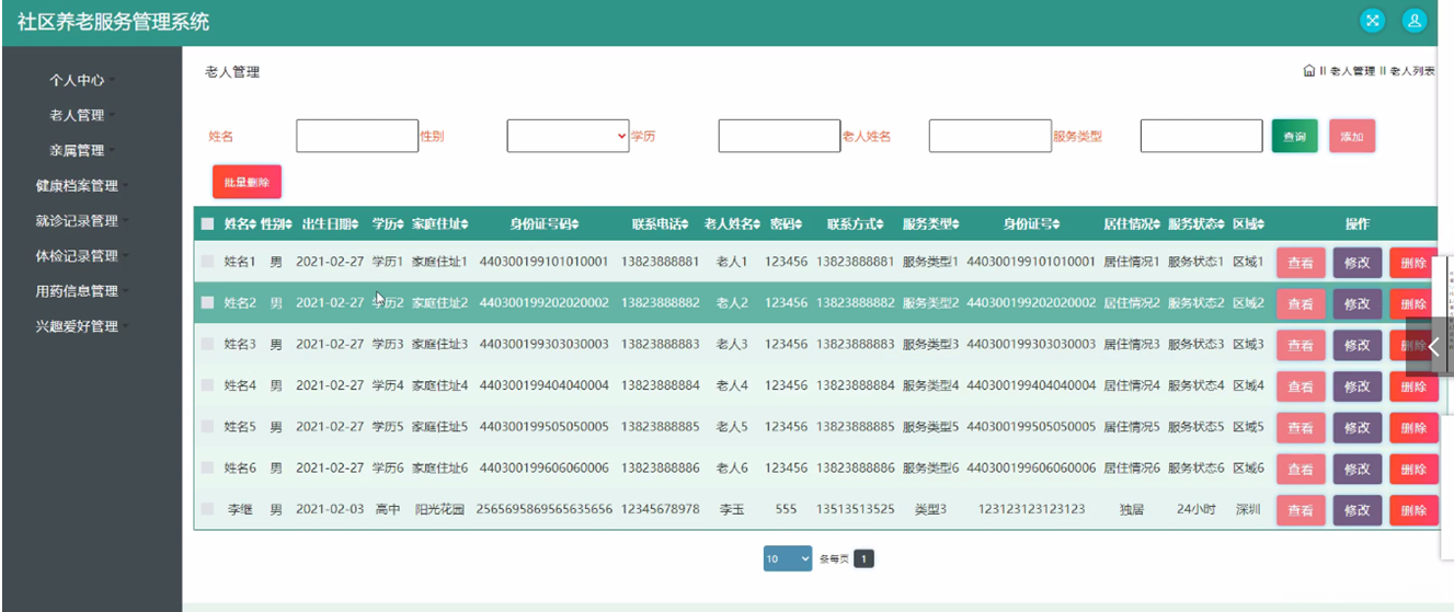 通过列表查看老人信息的基本资料包括姓名年龄性别出生日期学历等基础数据