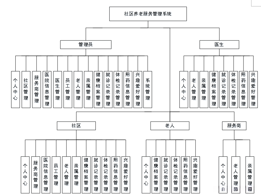这些功能可以完全满足社区养老服务管理系统的需求。此系统的功能比较全面具体结构如图4-3所示。