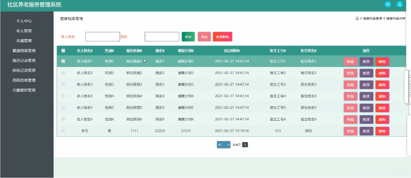 健康档案管理:通过列表完成老年人基本信息查询/更新/删除操作(包括但不限于:姓名、性别、病史记录等),具体内容可通过相关界面实现(如图5-7所示)。