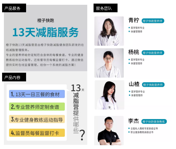 产品结构: (1)定制服务:3对1定制指导服务、13天减脂 营服务、21天产后食材营养师私教定制、指导健身 健康套餐)(2)健身面包:全麦面包、全麦代餐棒、全麦黑麦面包(3)肉类蛋白:鸡胸肉、去皮鸡腿、鸡肉肠、鸡胸肉丸、鸡胸肉套餐(4)每日冲饮:代餐粥、大麦若叶粉青汁