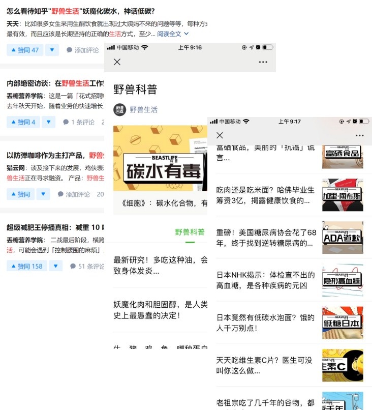 野兽生活****发展历程:2015年底, 「野兽生活」创立,早期受益于微信公众号 的红利,通过健康生活方式类内容获取了第一批几万人的种子用户。2016年, 开始做外卖餐饮类产品, 面向健身减脂人群推出低碳水午餐。2017年, 野兽生活开始转型做快消品 ,推出了防弹冲饮系列和能量棒产品。今年上线了预包装食品品牌“丢糖”,是面向大众消费者需求的一个探索尝试。