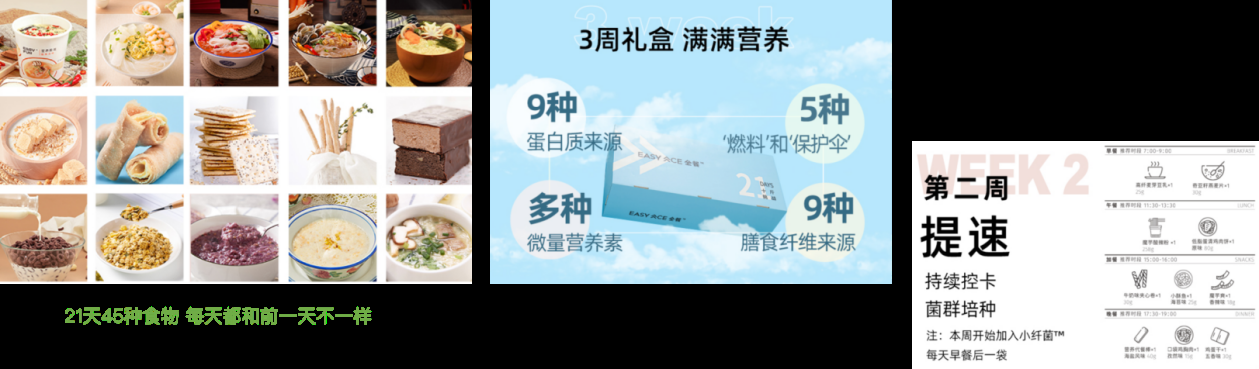 (1)产品研发差异化。 变化的产品,不变的产品逻辑。如继5月的“三日燃卡餐”甜蜜版后,超级零于8月重磅推出了“三日燃卡餐”热辣版,在其代餐产品线上再落一子。这款新品延续了“三日燃卡餐”的概念:主打“3天5斤”的瘦身功能,旨在通过断糖代餐形式,帮助消费者减少每日摄入的糖量,启动身体燃脂模式。相比过往版本,区别和变化主要在于甜、咸、辣等口味的占比。