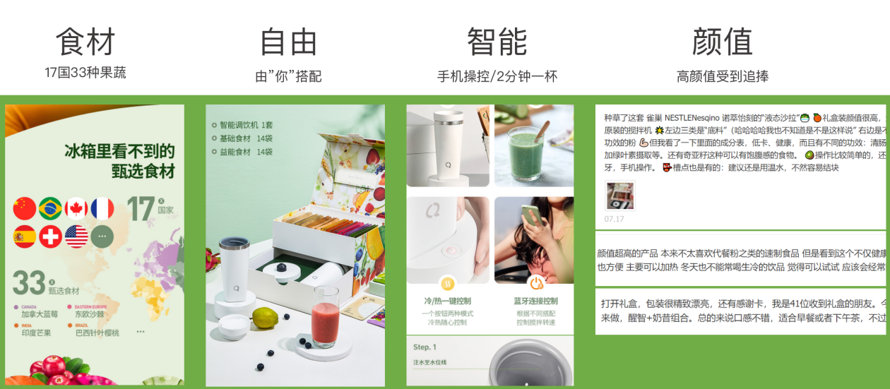 品牌简介: nesQino诺萃怡刻是由雀巢全球携手中国研发团队,用时18个月创新开发的系统健康轻餐方案。包含7款由甄选“超级食材”搭配而成、不同口味、提供不同有益能量的益能食材,与3款基础食材:奶昔、果昔、谷麦饮,以及一个智能控温且静音的Q-mug智能调饮机。