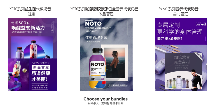 产品结构: NOTO系列益生菌代餐奶昔、NOTO系列加强版胶原蛋白全营养代餐奶昔、Smeal系列营养代餐奶昔;消费受众: 女性。