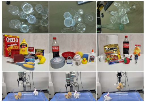 图6所示,在第一行展示了透明材质物体的图像,在第二行展示了复杂环境下的实例样本,并在最后一行展示了动态物体抓取场景的图像示例。这些图像均取自TRansPose数据集(185)、CEPB基准测试(234)以及Moving GraspNet(204)。