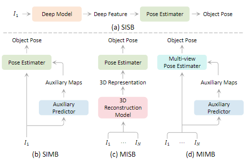这项研究的核心关注点在于基于RGB图像生成可靠的表征信息,并以此为基础为机器人后续操作任务提供可靠的技术基础。随着输入图像数量以及网络架构的不同情况变化,现有方法大致可分为四类:基于单幅图像的单分支结构(SISB)、基于单幅图像的多分支结构(SIMB)、基于多幅图像的单支结构(MISB)以及基于多幅图像的多支结构(MIMB),如图2所示。