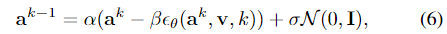 其中k取值为1至K代表了... α、β、σ是基于噪声调度机制下的函数... εθ由参数θ控制生成的去噪网络... N(0,I)服从标准正态分布的噪声.