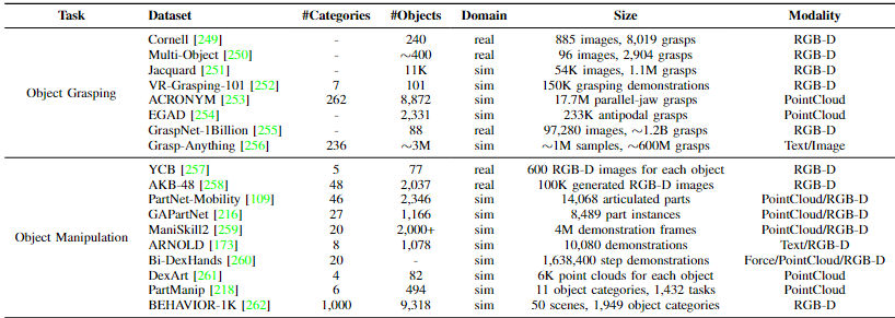 基于具体操作任务的不同现有数据集可以划分为两大类即对象抓取与对象操作表四列出了广泛使用的数据集其中大多数来自于模拟环境并且在类别对象数据域大小以及模式等方面存在显著差异具体而言这些数据集在上述几个关键方面存在明显差异