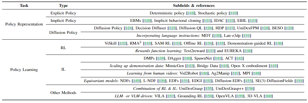 Embodied policy learning is designed to enable robots to achieve efficient decision-making for complex manipulation tasks. This section will categorize the embodied policy learning process into two fundamental stages: policy representation and policy training, which will elucidate how these techniques enable robots to attain predefined objectives. We tabulate key aspects of embodied policy learning in Table 2.