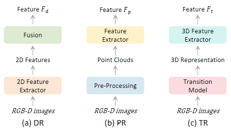 本节深入分析了3Daware这一特殊表达方式,并指出其核心特征在于将RGB-D图像作为输入数据进行处理。在现有研究中,针对这种表达方法通常会将其划分为三类:一种是基于深度特征的方法(DR),另一种是基于点云模型的方法(PR),第三种则是基于过渡分析的方法(TR)。这些分类方式如图3所示展示了不同研究方向的发展脉络。