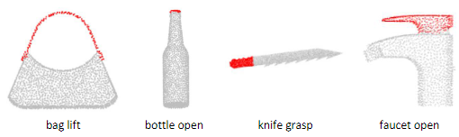 图4展示了基于数据集[100]中选取的四个具有代表性的affordance预测实例及其可视化结果。这些实例涵盖了提袋动作、打开瓶子操作、抓刀动作以及开启水龙头的动作。用于分类的目标区域使用红色标记进行标注。