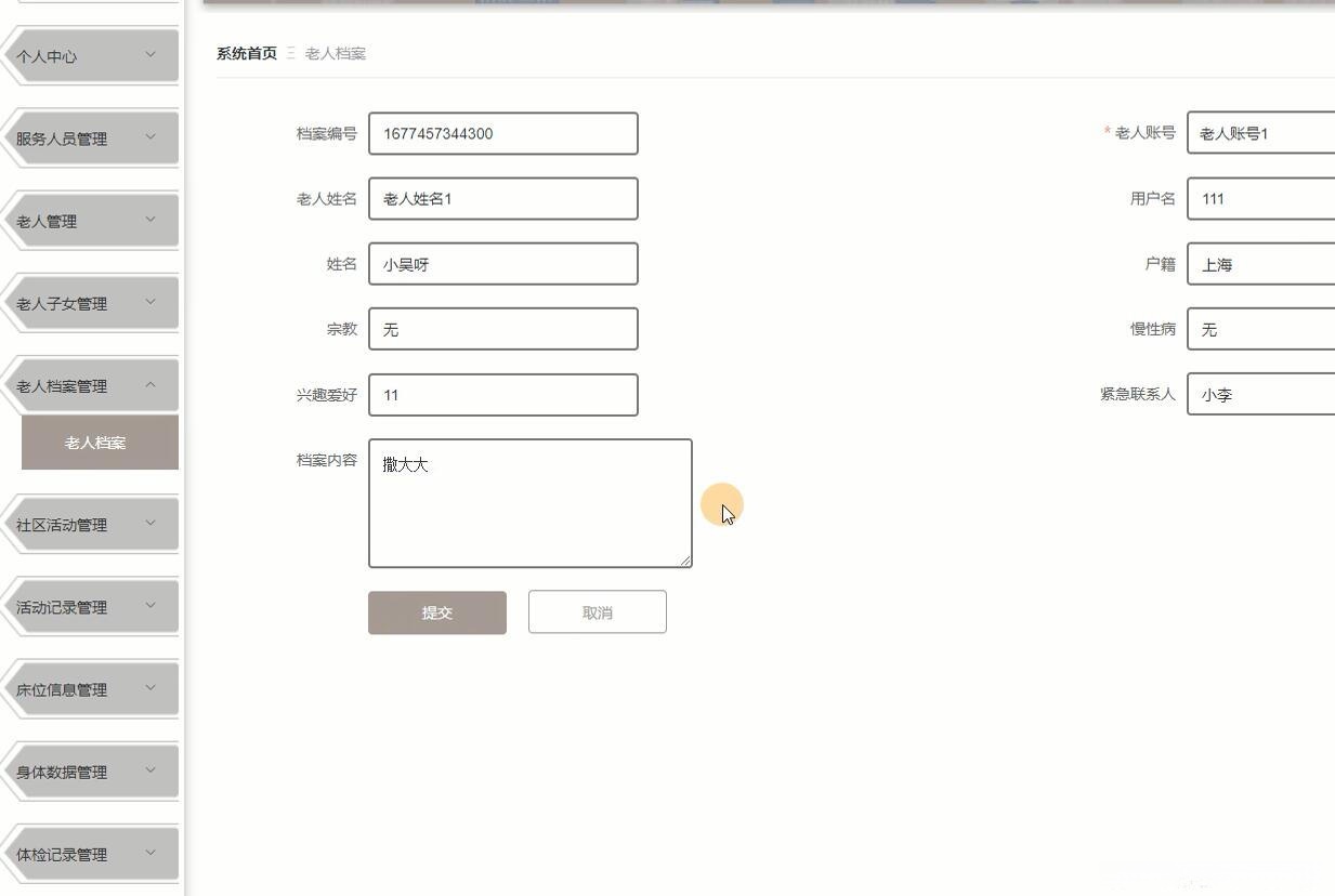 (4)老人档案管理:建立并维护每位入住老人的基本资料;