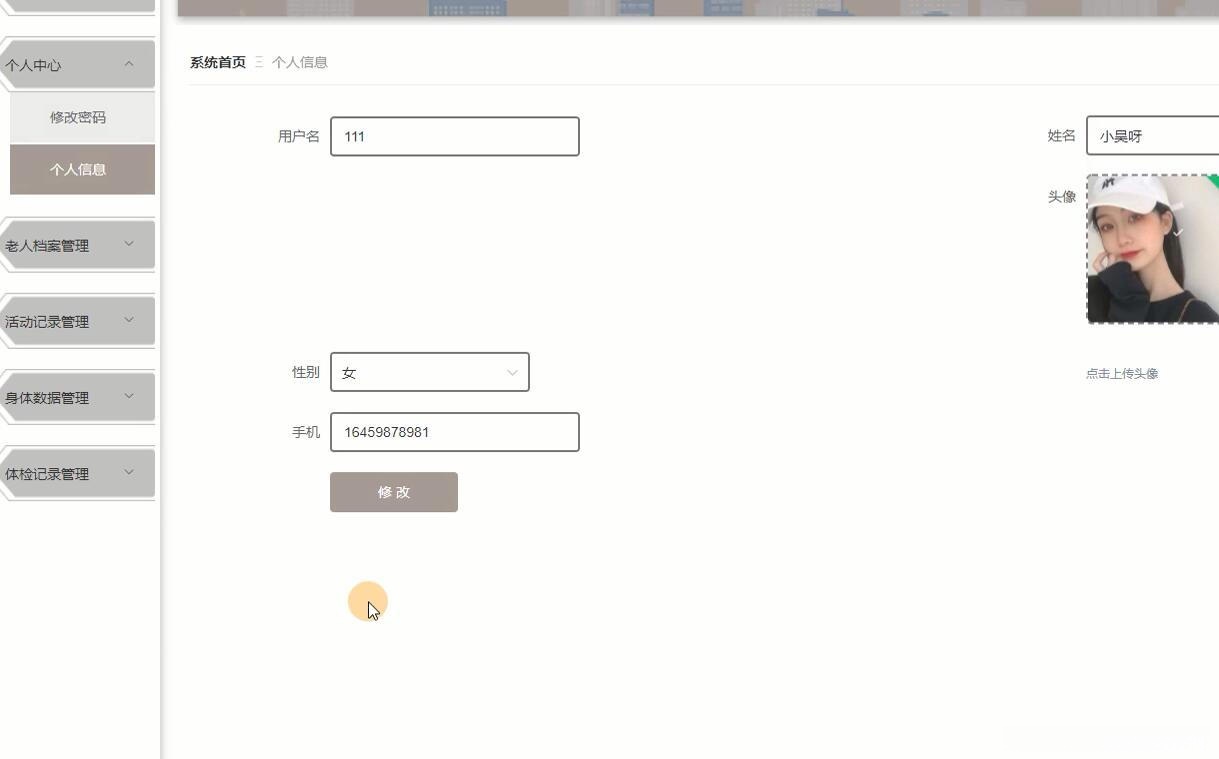 老人:老人登录系统后可完成对系统首页、个人中心、老人档案管理、活动记录管理、身体数据管理和体检记录管理等功能操作。例如图3-3所示。