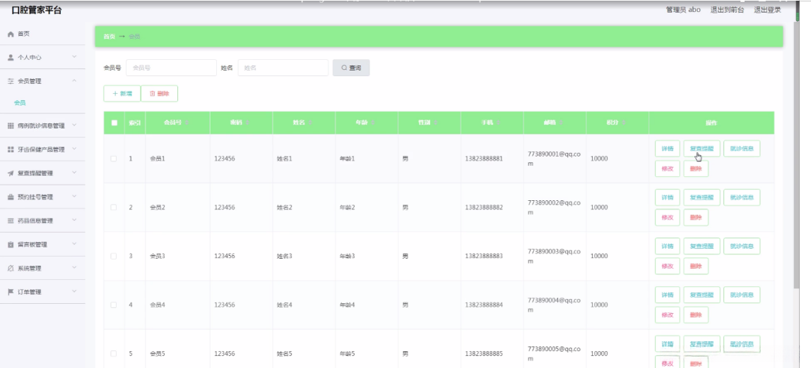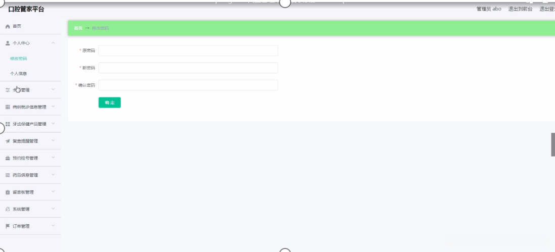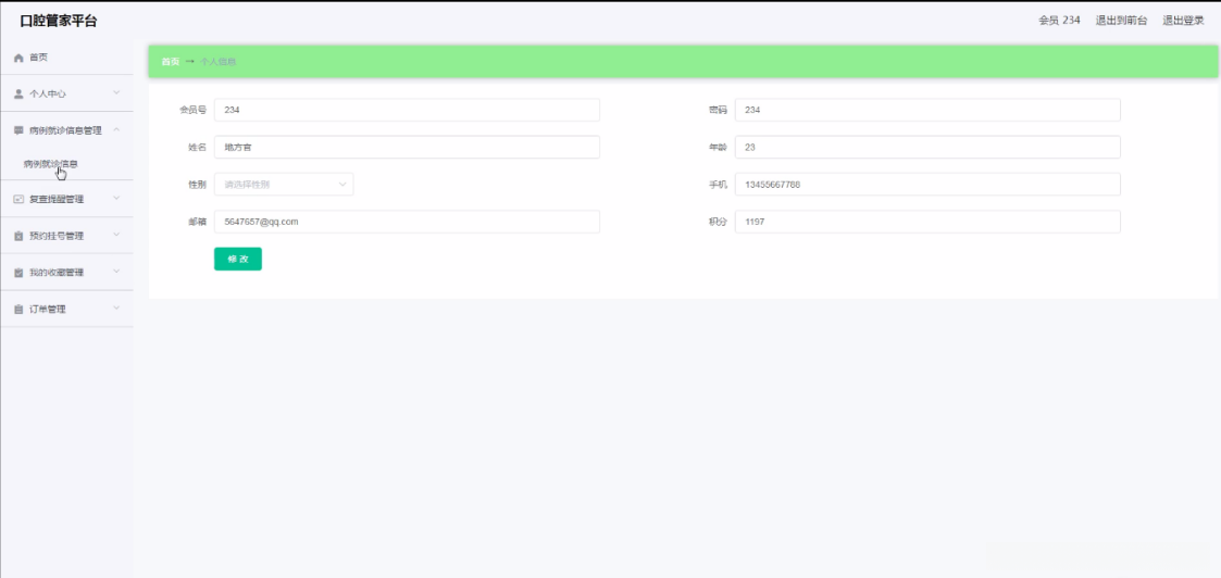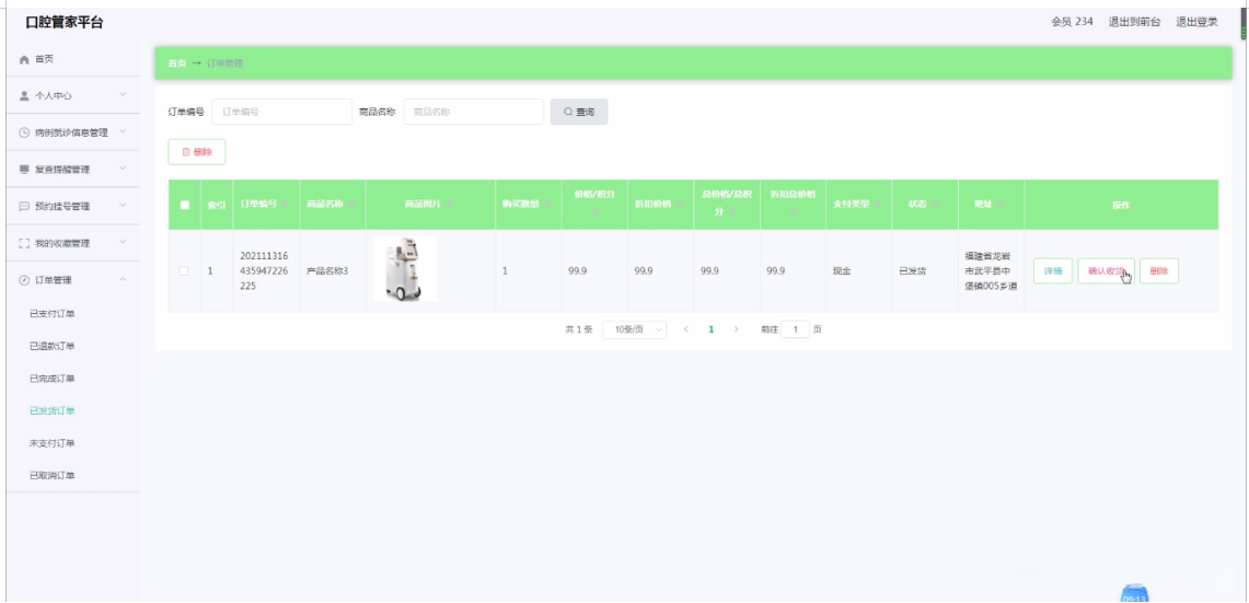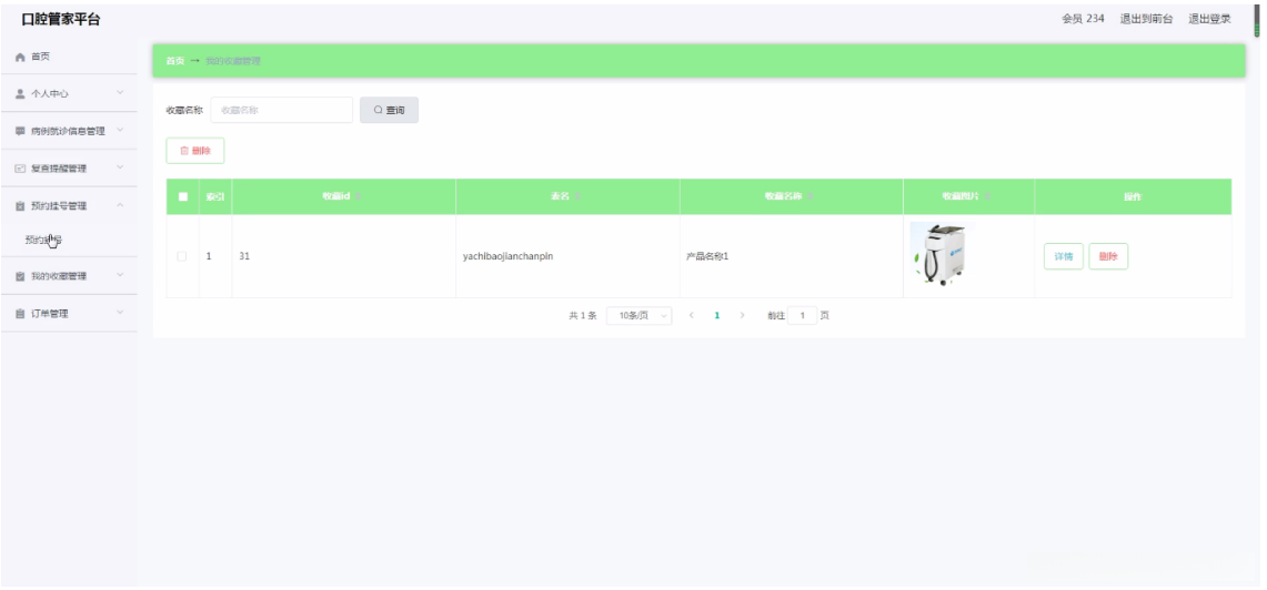通过登录口腔管理平台完成会员注册后,在线即可浏览 homepage(homepage)、my personal dashboard(个人中心)、病历信息档案整理(病例就诊信息管理)、定期健康提醒服务(复查提醒管理)、诊疗安排协调(预约挂号管理)等核心功能模块中查看所需内容;同时还可以维护我的收藏夹以及追踪订单状态(订单管理)。
