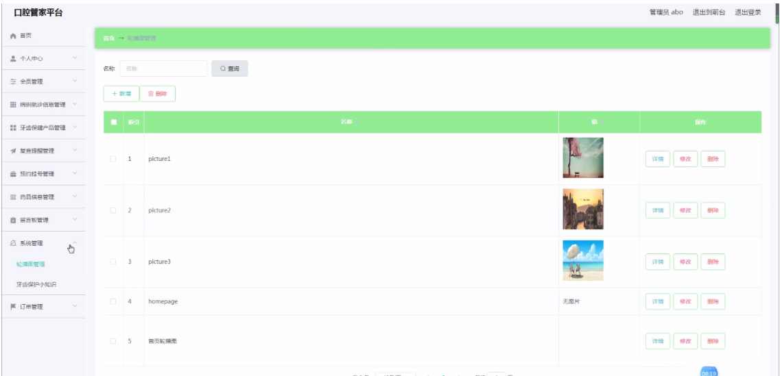 轮播版块;此页面为轮储图像管理界面。管理员可在该页面进行首页轮储板的管理,并可通过新增操作实现wheel图像的新增功能,在线更新现有图像,并可移除不再需要的图片。