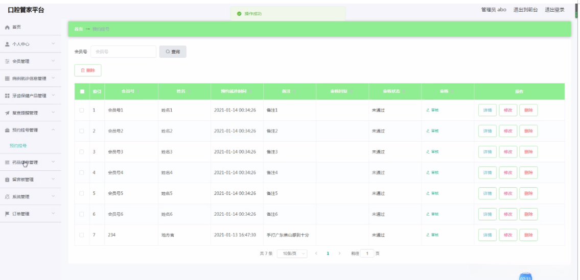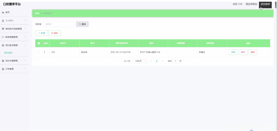 在该页面上可以查询会员编号及姓名信息,并根据具体需求完成预约挂号详情查询与编辑等操作;其中包含预约就诊时间安排及备注信息,并可查看相应的处理结果及状态更新情况;此外还可以对相关数据执行新增记录的操作