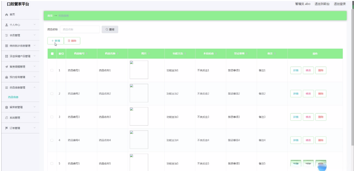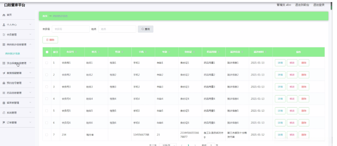本口腔管理平台基于Mysql数据库,在运用Springboot框架进行开发的过程中,着重优化了系统代码的可读性和应用广泛性,并具备良好的扩展能力和通用特性;同时界面友好且页面设计简洁。