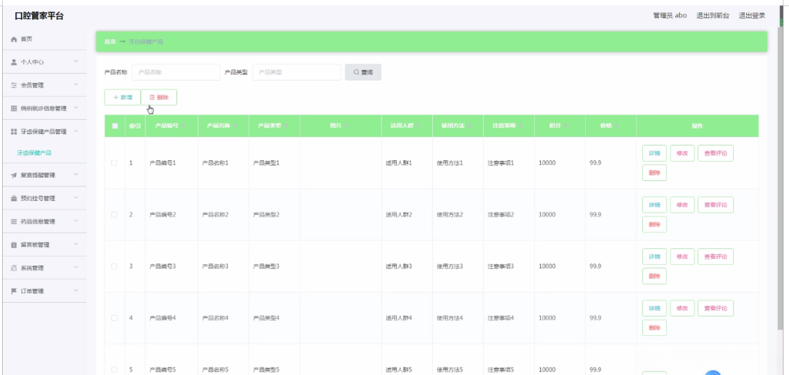 在相应的牙齿保健产品的管理系统上,在相应的牙齿保健产品管理页面上能够浏览到包括但不限于以下信息:产品的编号与名称以及分类信息;图片资料;积分值;适用范围;使用说明;以及注意事项等基础数据。此外还可以完成相应的添加新项目以及修改现有项目的功能。