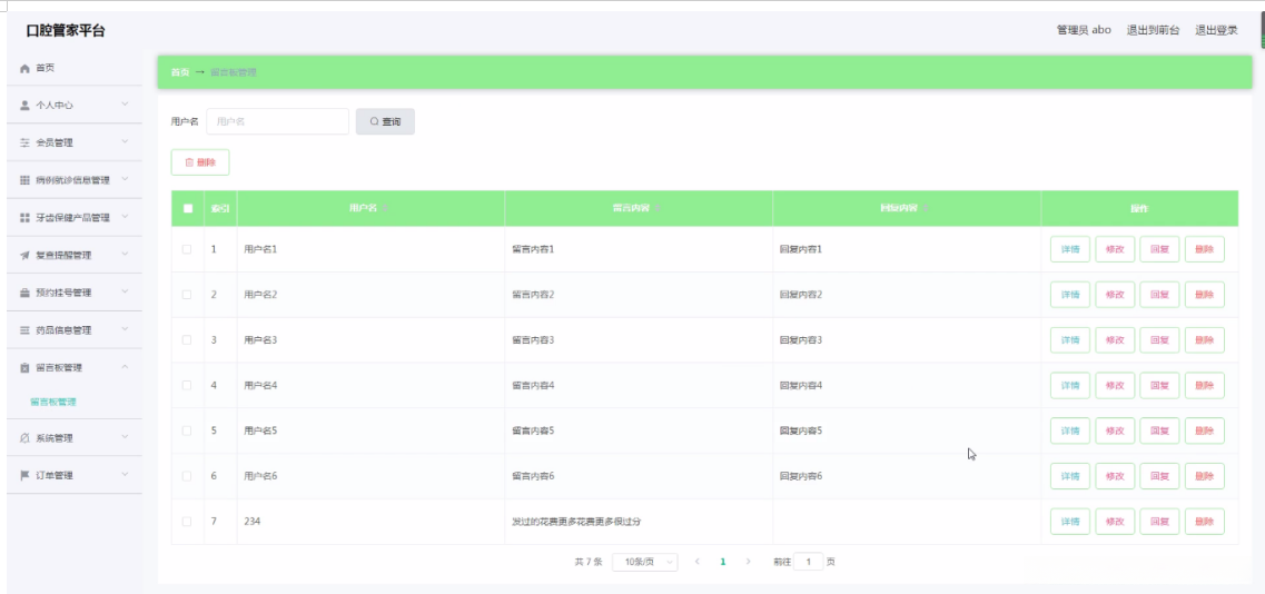 留言版块管理,在留言板管理界面中允许用户浏览用户名信息、留言内容以及回复内容等信息,并且根据实际需求完成详情操作、添加操作、修改操作以及删除操作等基本功能。