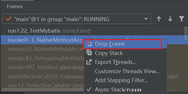在调用栈方法中选择一种需要回退的方式,在选定后通过右键点击选中'Drop Frame'选项,返回至当前所选方法之前一个被调用的方法处。然后按下F9键(Resume Program),即可观察到程序已到达所选断点位置。