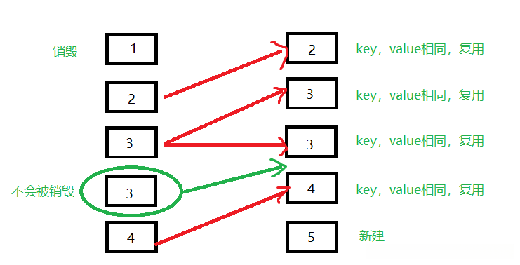 先来说下我的推测:在diff执行过程中,右边的前两个3的key和value与左侧第一个完全相同,因此可以将其直接复用。至于左侧的第二个3,虽然没有被复用,但也不会被销毁,因为销毁的条件是新旧元素在key和value上存在差异。显然,第二个3的key和value与前两个3完全相同,因此不会被销毁,从而得以保留。为了更好地理解这一过程,我绘制了相应的流程图。