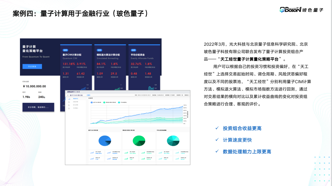 天工经世量子计算量化策略平台 于 2022 年 3 月由中国光大科技有限公司与北京量子信息科学研究院及北京玻色量子科技有限公司共同推出, 是 quantum computing quantitative strategy platform 在中国金融行业的首个官方上线版本。该平台上,用户可以根据个人的投资风格和风险偏好, 自定义其起始交易时间点以及调仓周期设置, 并采用模拟相干量子计算方案、模拟退火算法以及模拟市场指数方法来进行回测分析, 系统会对其交易结果的表现比较以及累计收益曲线的变化来评估投资组合策略的有效性。