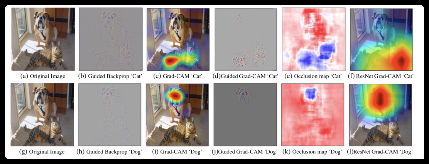 图1分别展示了对狗和猫的可视化效果。然而第2列虽然具有良好的细节刻画能力(b选项),却未能有效区分两类动物(两种方法在分类界限上非常接近),但从第3列可以看出我们的方法在分类界限上非常清晰。同时如果将grad-cam与像素空间梯度结合在一起进行可视化处理就能实现分类清晰且具有高分辨率的效果