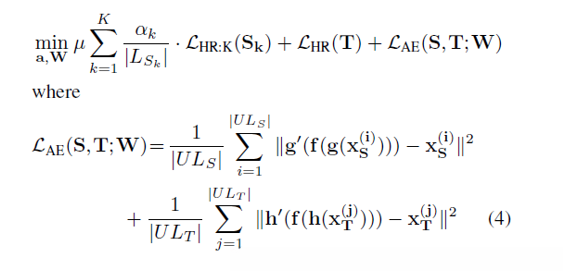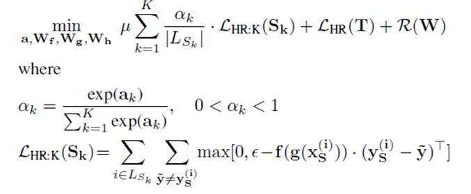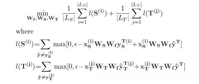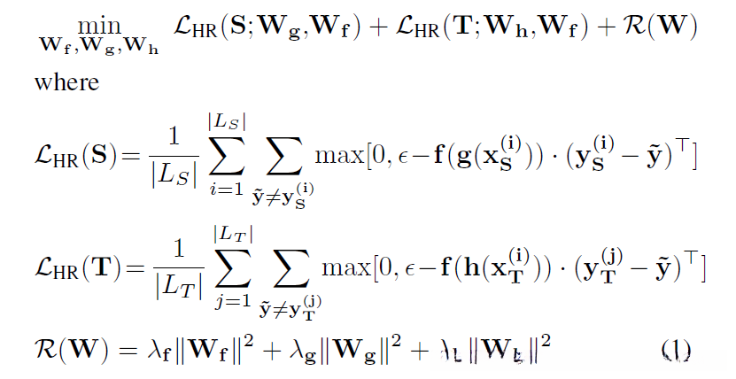 我们可以看出损失函数由两部分组成:源数据集上的loss和目标数据集上的loss。深入观察后发现,尽管期望实现transfer learning(迁移学习),但这一过程并非想象中那么简单。可能是因为我的知识储备有限,在面对这一问题时显得力有未逮。不过事实证明,在源数据集上我们拥有完整的标注信息(complete annotation),而目标数据集中的标注比例却相当低(low annotation rate)。通过实验结果表明,在这篇文章中所使用的测试集中目标数据集仅占10%的比例被标注了标签(label),而在实际训练过程中正是利用了这一小部分的数据进行学习(training)。虽然这个10%的比例看似偏低(seems a bit low),但还有更低的情况(如one shot问题)以及极端情况下的zero shot问题(零次学习问题)。然而这些特殊场景通常需要借助先验知识等辅助工具才能解决。正因为获取带标签的数据需要耗费大量的人力物力资源,在推动迁移学习领域的发展方面起到了重要作用。说实话,在进行大规模图像数据标注工作时确实让人倍感压力:既要耗费时间和精力又要承受失败带来的挫败感——标错了标签更是让人抓狂不已!所以希望大家在使用别人提供的数据集时能心怀感激之情:滴水之恩当涌泉相报!回归正题,在公式推导过程中涉及的关键变量包括f, g, h等已做详细说明(这些符号的具体含义请参考前面的内容)。而W则是一个大家耳熟能详的基本参数矩阵,在这里不做过多赘述。其中X_s代表源域的数据集合(source domain dataset),X_t代表目标域的数据集合(target domain dataset),而Y_s和Y_t分别对应于这两套数据集合的目标类别标签集合(label sets)。需要注意的是,在公式推导过程中对这些变量下标的定义均为$i=1,2,...N_i=1,2,...N表示第i个实例的具体索引值