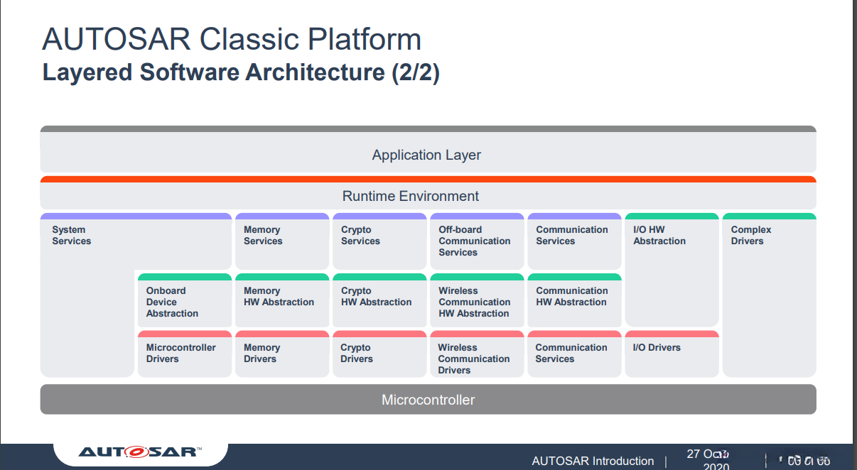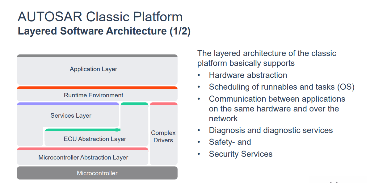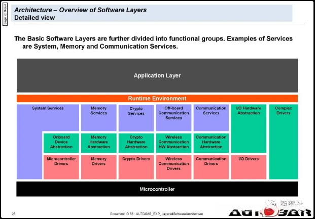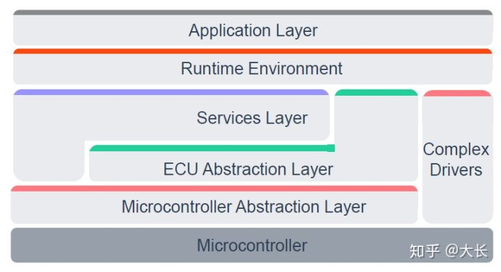 - 微控制器抽象层(Microcontroller Abstraction Layer,MCAL) :是与硬件直接相关的驱动软件,例如对存储器、通信寄存器、IO口的操作等等。