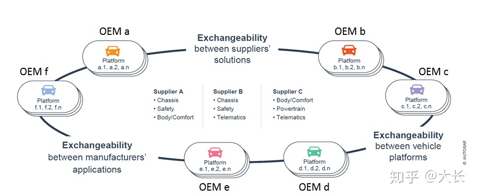 汽车行业里有众多的整车厂(OEM)和供应商。一般来说,每一家OEM会生产不止一种车型,每一家OEM对不同子系统和零部件会选择不止一个供应商,每个供应商也会向不止一家OEM供货。减少开发成本最有效的办法就是,尽可能让产品可重复利用,用数量来分摊开发成本。OEM希望可以让同一套系统和部件用在不同的车型上;同一辆车上来自不同供应商的的各个系统和部件可以相互兼容;而供应商希望开发出来的部件和算法可以通过简单的软件调整就供给不同的OEM。