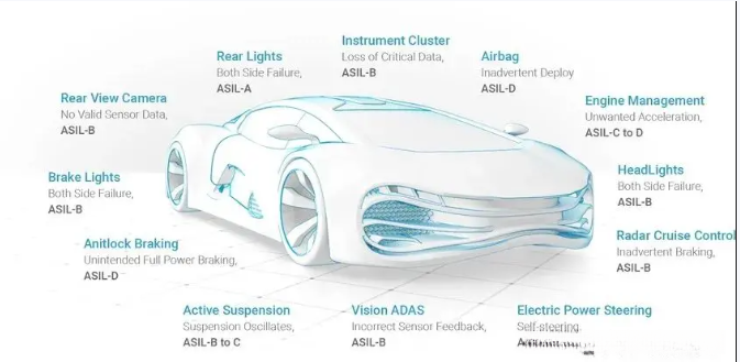 安全气囊、防抱死制动系统和动力转向系统必须达到 ASIL D 级,这是应用于安全保障的最严苛等级,因为其失效带来的风险最高。而安全等级范围的最低等级,如后灯等部件,仅需达到 ASIL A 级即可。大灯和刹车灯通常是 ASIL B 级,而巡航控制通常是 ASIL C 级。