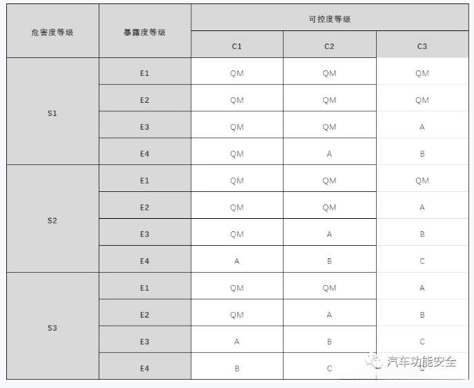 严重度 严重度是指当危害事件发生时,相关人所受到的伤害程度。这里的相关人既包括车内的驾驶员、乘客,也包括了其他交通参与者,比如路上的行人。ISO 26262将严重度分成了S0、S1、S2和S3四个等级,严重程度随着数字递增而增大。暴露度 暴露度是指危害事件相应场景的暴露概率。ISO 26262将暴露度分为E0、E1、E2、E3和E4五个等级可控度 可控度是指危害事件发生时,驾驶员或其他交通参与者对危害的控制程度,或者说是避免危害的能力。ISO 26262将可控度分为C0、C1、C2和C3四个等级。需要注意的是,与严重度、暴露度不同,C的数值越大可控程度越低。ASIL 将前面提到的各个等级的严重度、暴露度和可控度进行组合,就得到了如下表所示的ASILA、B、C和D四个等级。