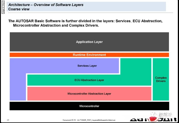 - 运行环境(Runtime Environment,RTE) :是AUTOSAR的核心,它将应用软件层与基础软件层剥离开来,为应用层软件提供运行环境,如进程时间片调度、应用层模块之间以及应用层与基础软件层之间的数据交换等。