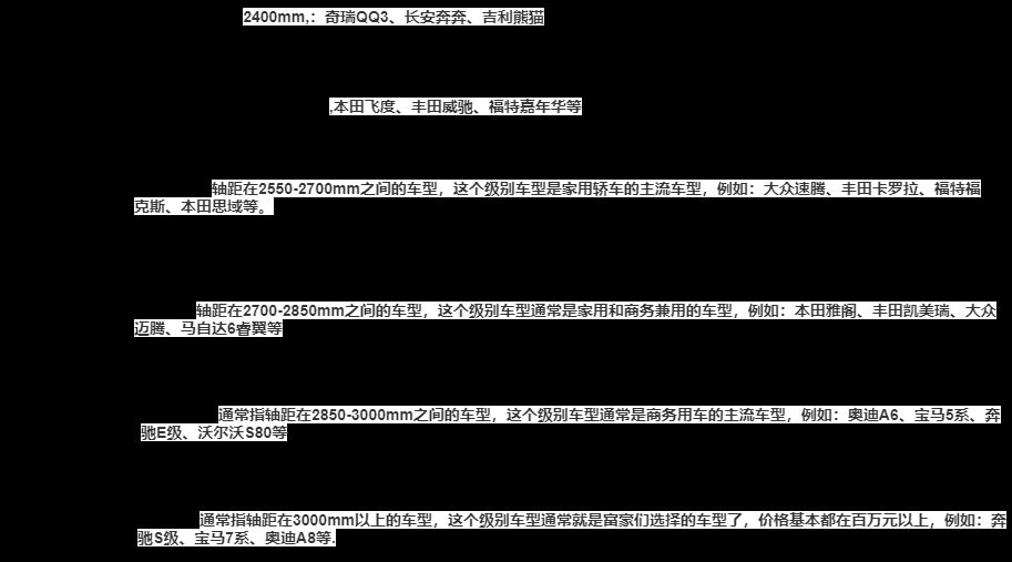 轴距就是汽车前轴中心到后轴中心的距离。对于三轴以上的汽车,其轴距由从前到后的相邻两车轮之间的轴距分别表示,总轴距为各轴距之和,汽车的轴距短,汽车长度就短,质量就小,最小转弯半径和纵向通过半径也小,汽车的机动性就好。但如果轴距过短,则车厢长度就会不足,后悬 (车辆最后轮轴线与汽车最后端的距离) 也会过长,就会造成行驶时纵向摆动大及制动﹑加速或上坡时质量转移大,其操纵性和稳定性就会变坏。如果轴距过长,就会使得车身长度增加,从而后部倒车盲区也会偏大,如果不增加倒车雷达,倒车对新手而言是个严峻的考验,根据各国车型的特点,一般同一类型的车型,欧洲品牌车型的轴距比较小,而美国品牌车型的轴距比较大,日韩系车是中间水平.