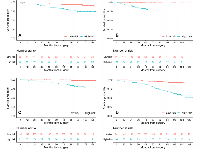 Figure 3: Kaplan-Meier survival curves stratified according to the dichotomized deep learning (DL)–driven risk scores show (A) overall survival (OS) in the internal test set using the DL-driven 4-year risk scores and (B) freedom from recurrence, (C) lung cancer–specific survival, and (D) OS in the segmentectomy test set using the DL-driven 2-year, 4-year, and 6-year risk scores. The cutoffs were determined empirically as the median values in the internal validation set, which were 1.36% for the DL-driven 2-year risk score and 4.36% for the 4-year risk score. The cutoffs remained unchanged regardless of the study outcome.