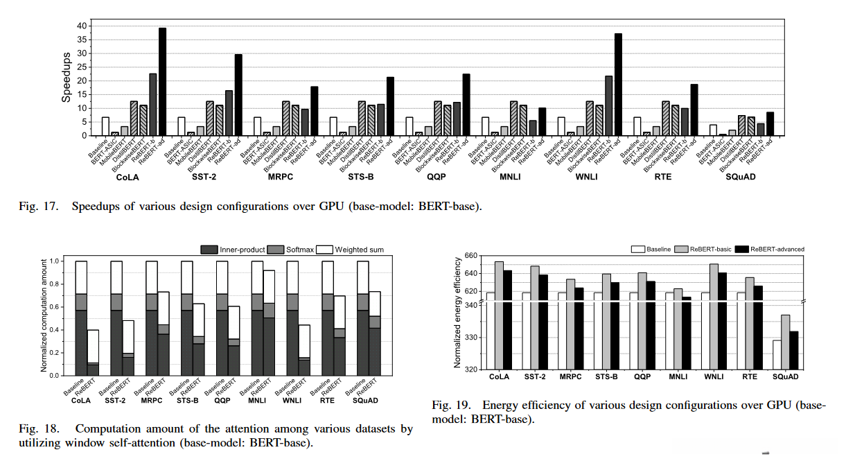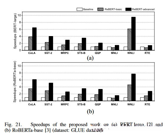 而ReBERT-advanced采用了双阵列输入设计,并有效利用了窗口自注意力机制的优势;相较于GPU而言,其平均执行速度提升了约24.6倍;在GLUE数据集上的测试结果显示,在基线与ReBERT-basic相比,该方法分别实现了3.7倍和1.8倍的性能提升。