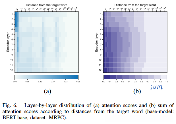 - 在自注意力机制中,则更倾向于集中于与目标词语位置相邻的词语,并且这些词语往往在整体上呈现出较高的注意力评分(如图6所示)。可以看出,在这种情况下较高的评分主要集中在了目标词语周围的位置。