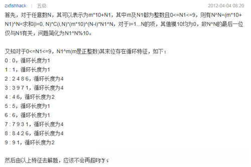立刻想到:"其实很简单嘛!就是让这个数字自乘若干次后进行模运算来获取最后一位数字啦!"