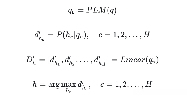- Hop Prediction(跳数预测):该步骤的主要目标是估算关系路径的数量级,并以此指导后续推理方向的选择。研究者将这一过程建模为基于预训练语言模型(PLM)的分类模型,并设计了一种高效的特征提取方法以辅助这一目标实现.具体而言,对于输入的问题𝑞,研究者通过利用PLM模型对输入的问题𝑞进行编码处理,并生成相应的向量表示