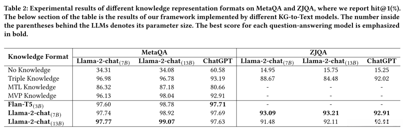 评估指标:考虑到LLM一般返回一段文本作为回应而不是单一的答案实体因此采用 hit@1 作为一个评估标准来衡量答案 𝑎 的准确性。换句话说如果答案 𝑎 至少包含一个真实实体则被视为问题已被正确回答。