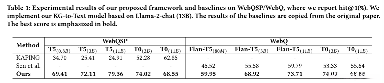 - 为了解决KG-to-Text语料库标注不足的问题,设计了一种自动的KG-to-Text语料库生成方法。提取与问题相关的子图,并利用ChatGPT作为语料库生成的工具。基于问答型LLMs的反馈,我们生成对答案敏感的知识描述,用于构建KG-to-Text标记数据。我们在生成的语料库上微调了几个开源LLM,并研究了不同LLM生成的文本知识对KGQA的影响。