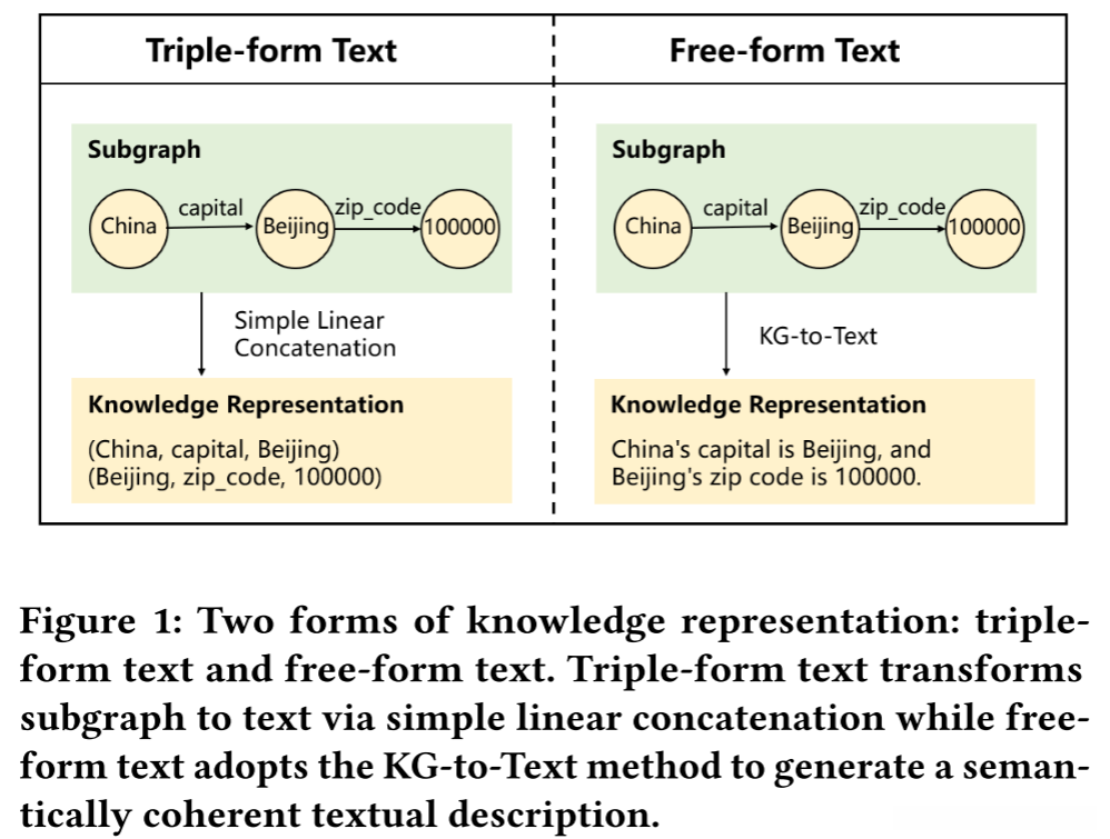 *对两种知识表示格式进行总结:三元组形式文本与自由形式文本。将三元组形式转化为结构化文本的方式较为简单。基于KG-to-Text方法的自由形式文本能够生成具有语义意义的描述。