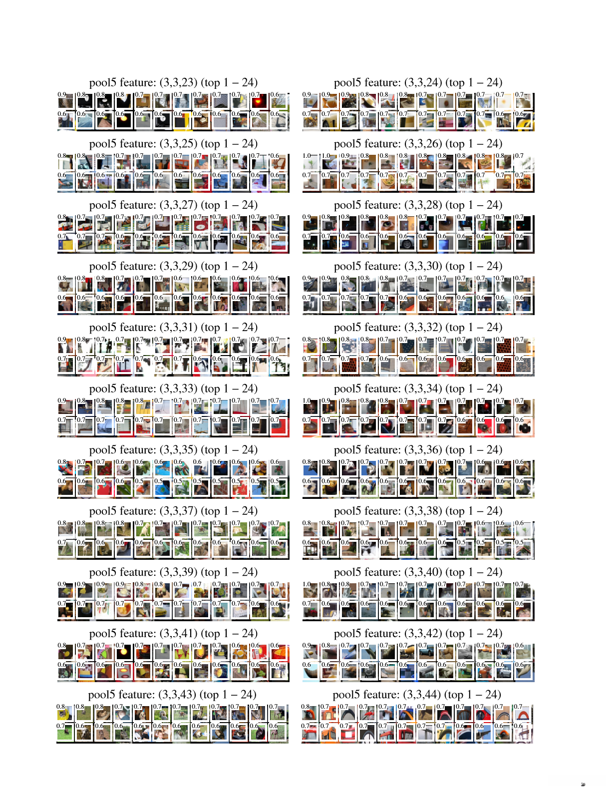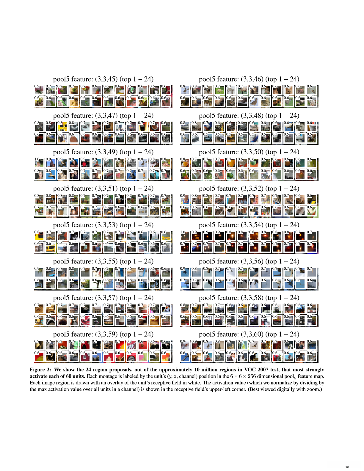 该图展示了池化层5(Pool5)的69个特征,在VOC2007数据集中前24个最大激活响应的建议区域中进行了展示。每个特征在其池化层5(维度大小为6×6且通道数为256)的空间位置上进行了标记,在二维坐标系中用(y,x,channel)表示其所在的位置坐标。(y,x)坐标确定了感受野的位置
